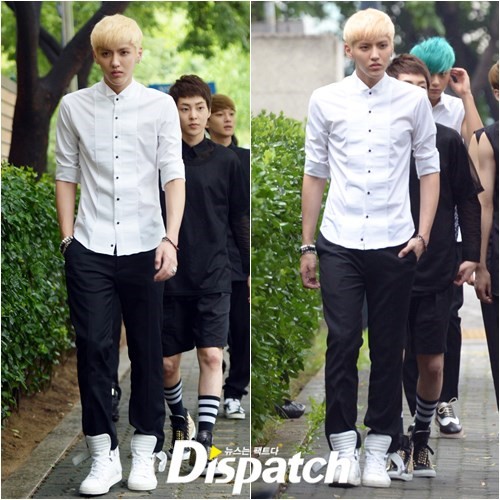 시우민입니다. 한 마디로, 귀엽습니다. 방글방글 꽃미소를 날리며 수호에게 말을 건넵니다. 걸음걸이도 발랄합니다. 그래서인가요? 의상도 홀로 귀요미 룩입니다. 유일하게 무릎 위로 올라오는 팬츠를 입었더군요.