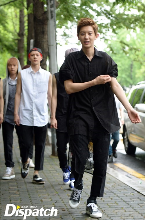 첸입니다. 기분이 좋아 보이네요. 디오, 백현, 찬열 등 멤버들과 이야기를 나누고, 웃으며 고개를 끄덕입니다. 지나가는 팬들을 보고 미소도 짓더군요. 민소매 셔츠 밖으로 보이는 탄탄한 팔근육, 남성미 물씬 풍깁니다.